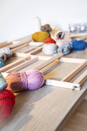 Vævning på væveramme er en tydelig proces som giver indblik i hvordan garnerne arter sig og påvirker hinanden. Væveprocessen kan sammenlignes med at tegne. Vævenålen og garnerne er dine farveblyanter og papir. Der er noget tilfredsstillende over at se vævningens udvikling fra garn til tekstil. Du kan købe væveramme og redskaber her eller du kan deltage i et hyggeligt og inspirerende vævekursus her.